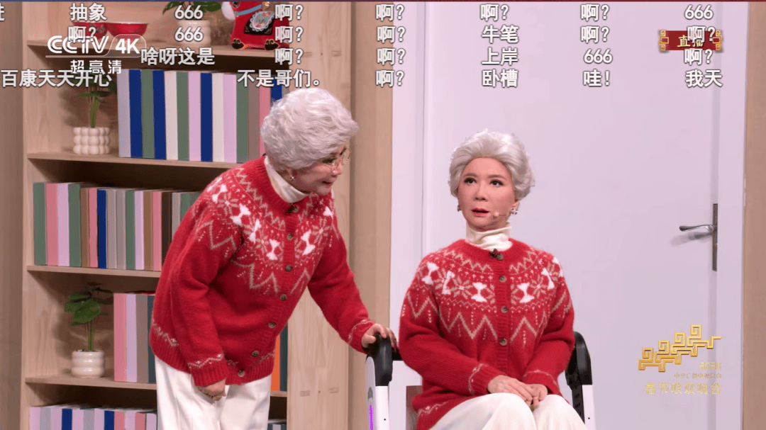 举个例子,在今年春晚蔡明、王天放表演的节目《奶奶的最爱》中,弹幕“啊?”高强度出现,尤其是在最后机器人分身亮相时,弹幕区整齐划一的 “啊?” 直接把氛围感拉满;